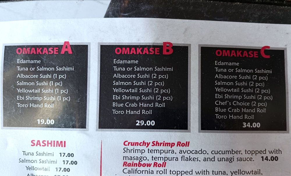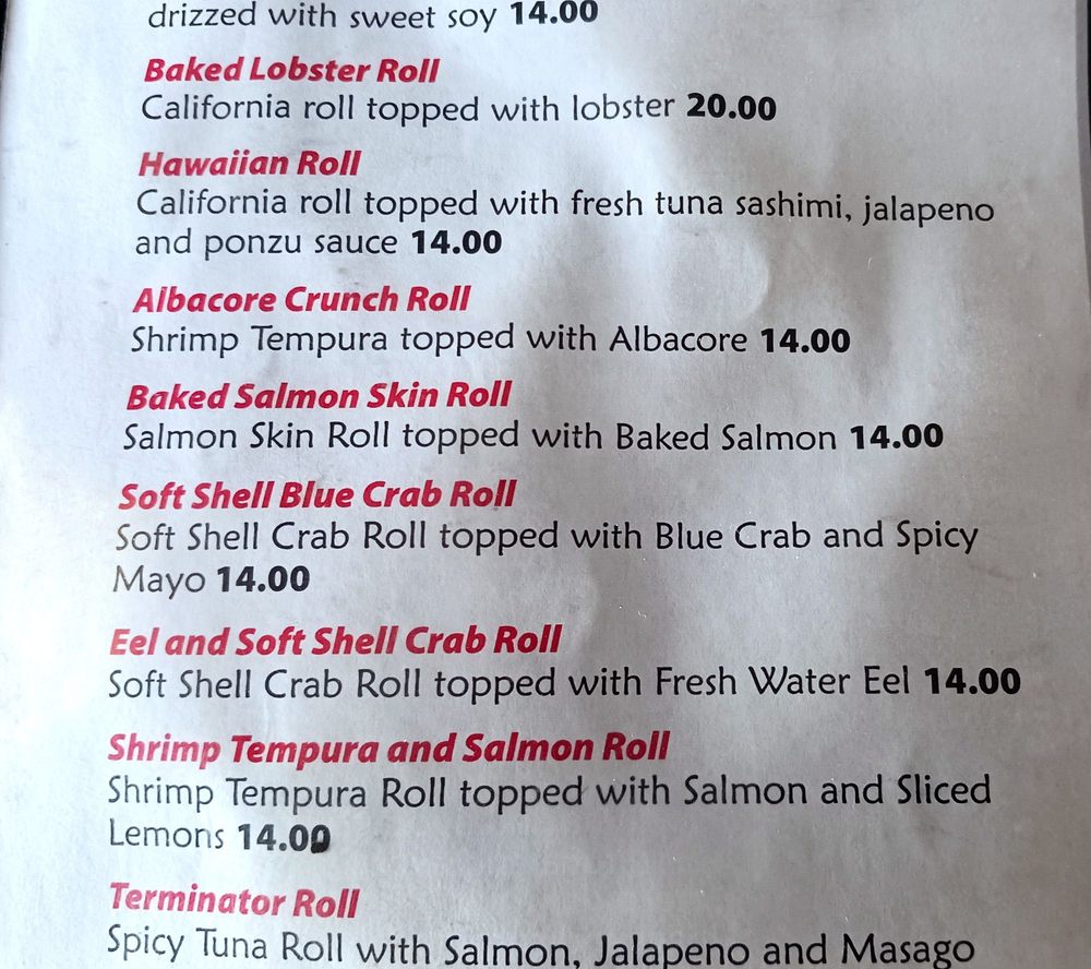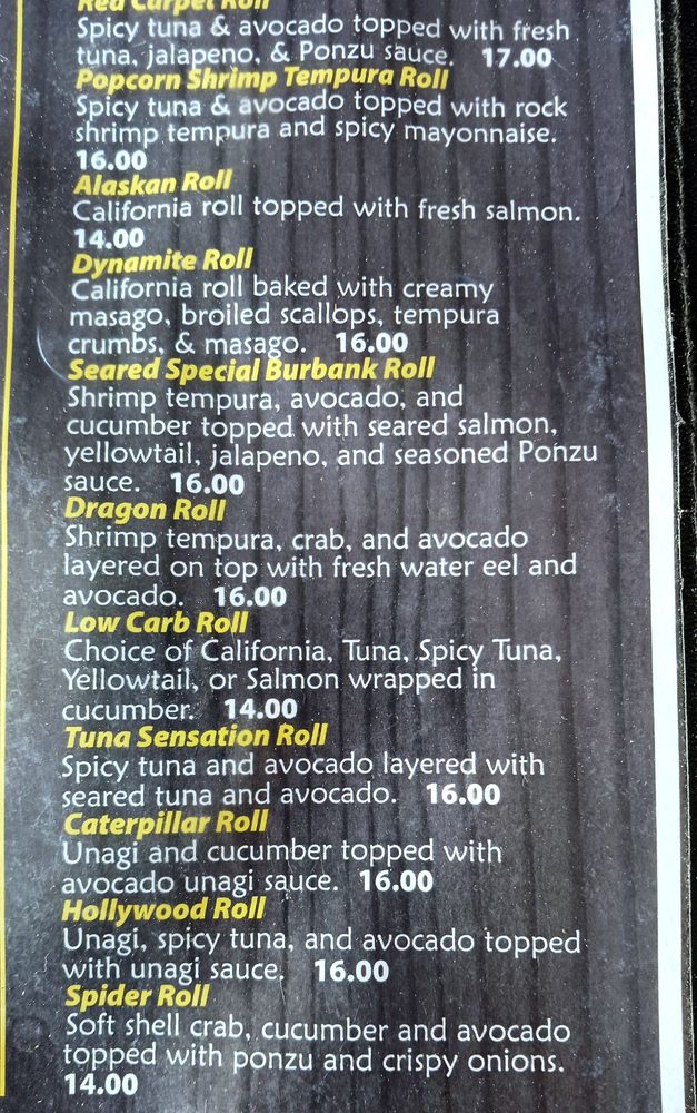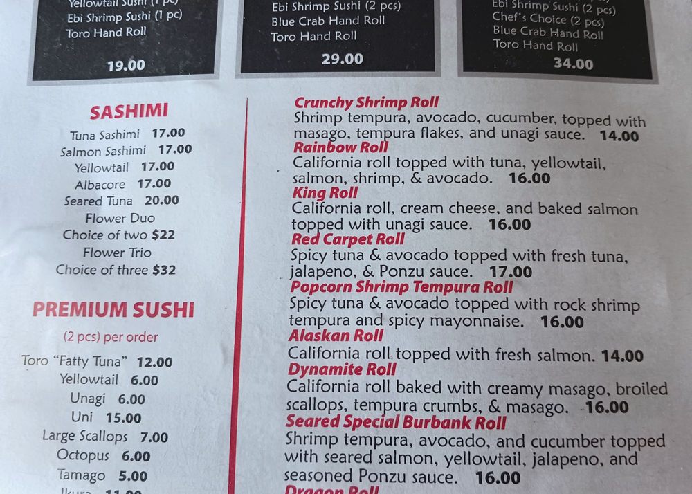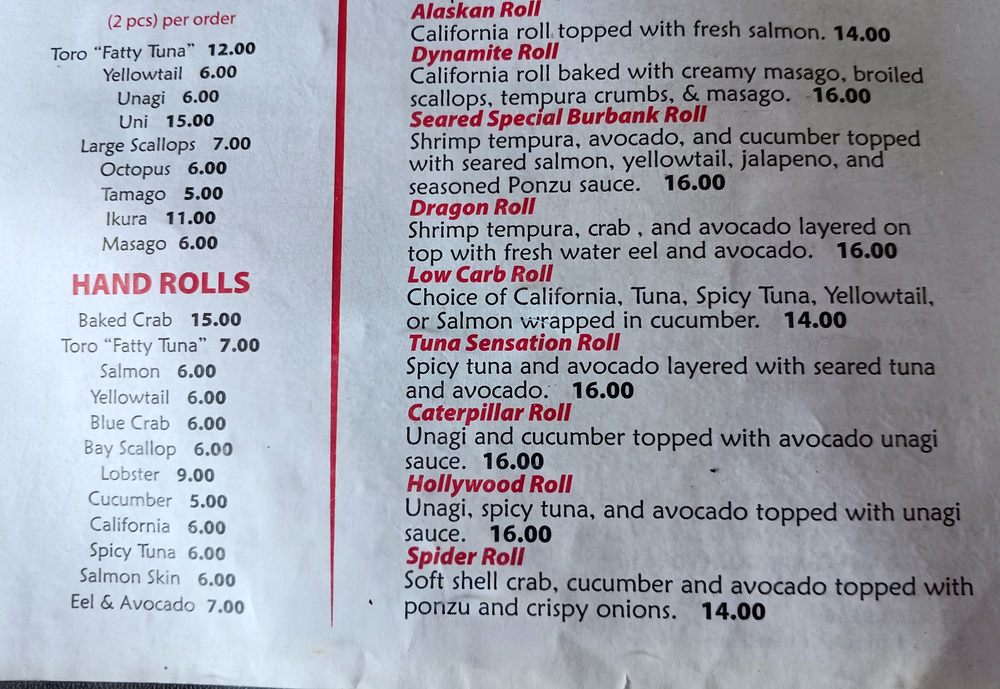 Choice inside: California, spicy tuna, salmon, tempura shrimp, tuna, yellowtail, albacore. Choice outside: California, spicy tuna, salmon, tuna, yellowtail, albacore, masago, baked scallops.