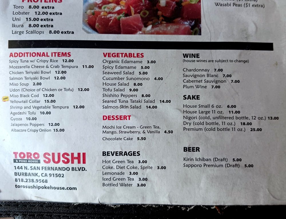 Toro Sushi Poke House in Burbank offers a wide array of sushi and poke bowls with options for vegetarians and vegans. The menu includes signature poke bowls like the Classic Ahi Tuna and Spicy Salmon, as well as customizable Build Your Own Bowl options. Sushi lovers can enjoy a variety of options such as Salmon, Tuna, Yellowtail, Eel, and more. Customers praise the quality of the fish and the competitive prices, with special mentions of the Omakase B Menu and happy hour deals. The cozy atmosphere and attentive service add to the dining experience. Whether you're in the mood for fresh sushi or a flavorful poke bowl, Toro Sushi Poke House is a must-visit spot for sushi and seafood enthusiasts in the heart of downtown Burbank.